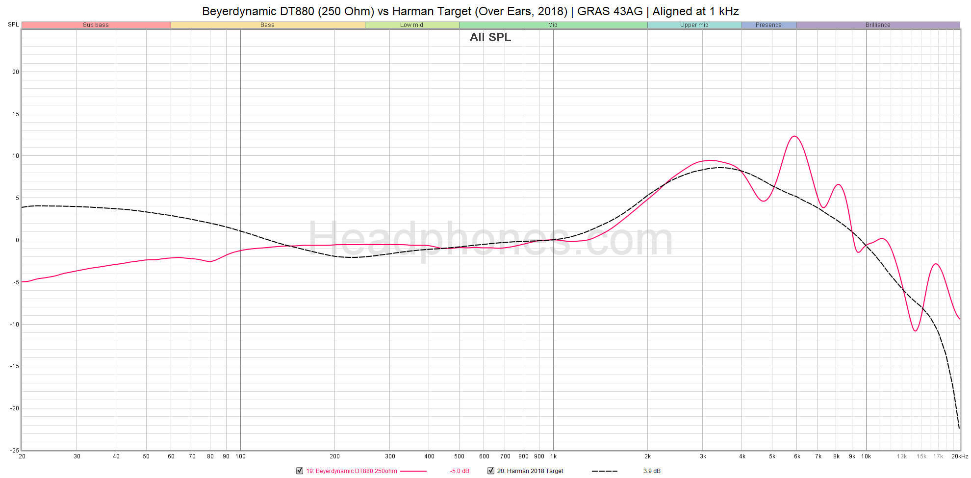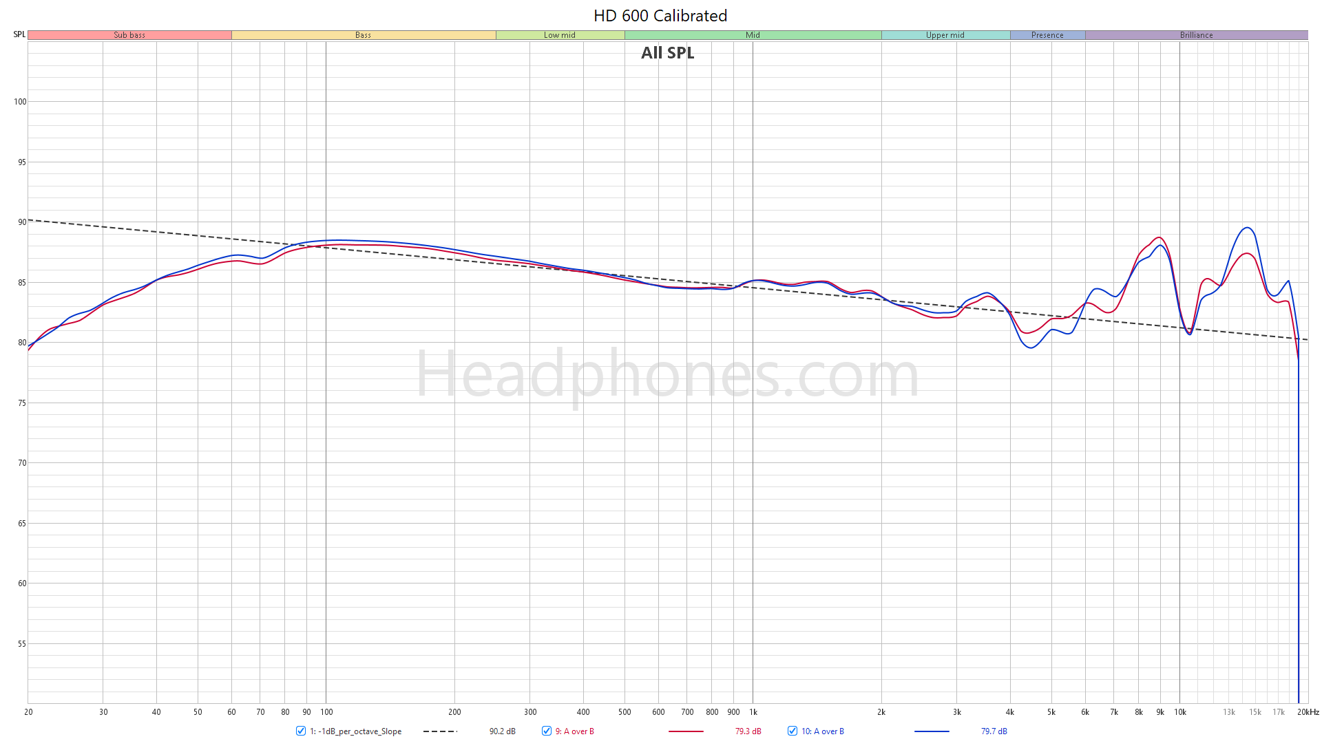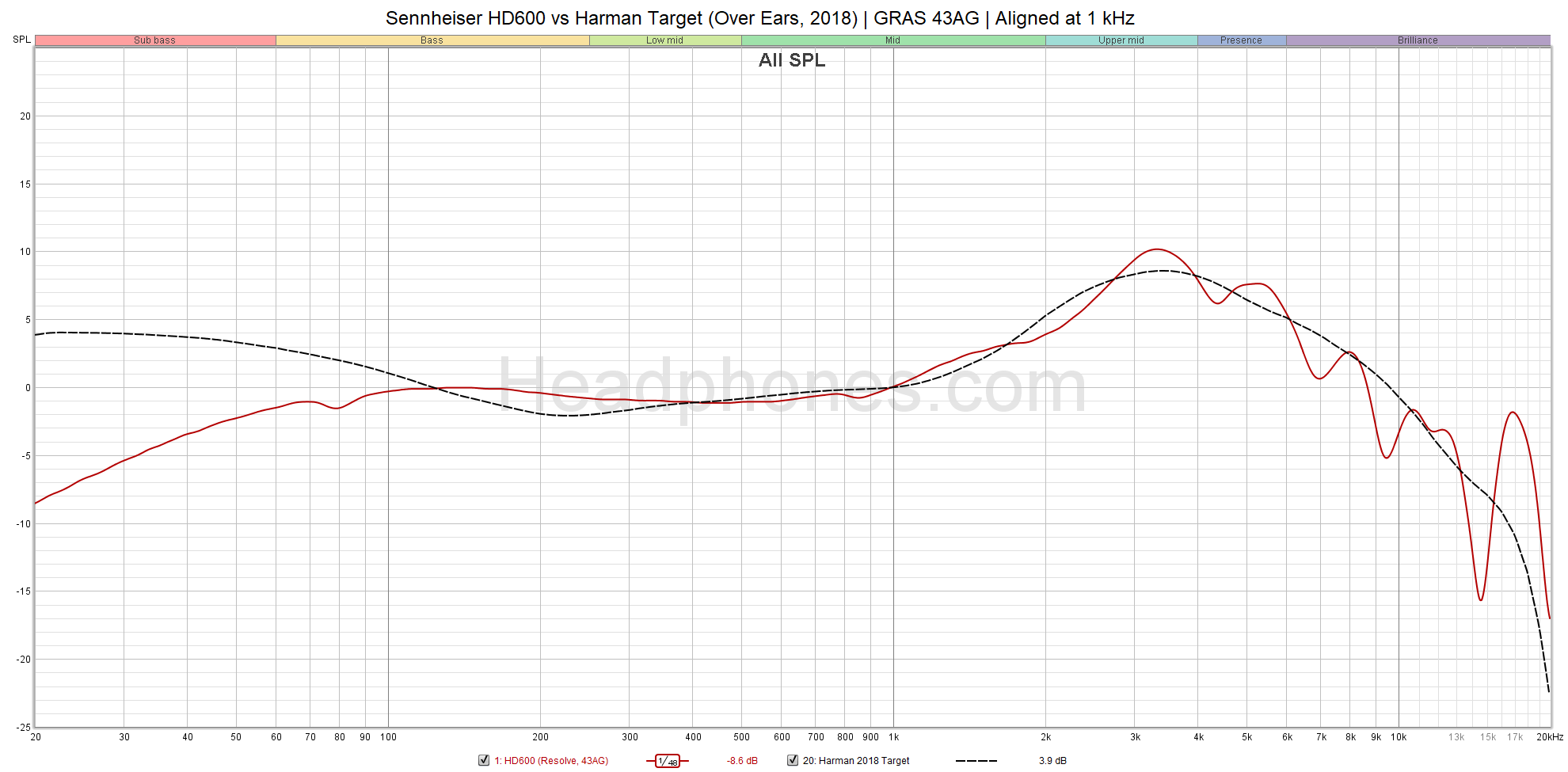 - Read the legend. The red line represents the Sennheiser HD600 while the dotted black line is the Harman target.