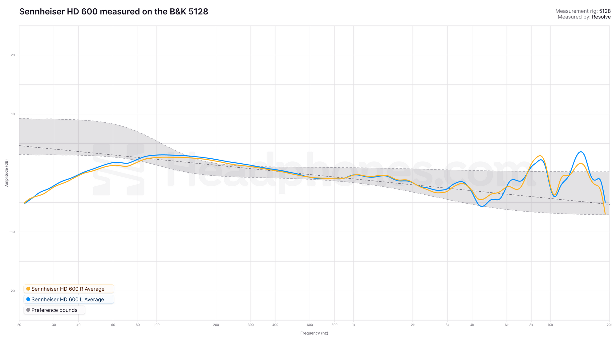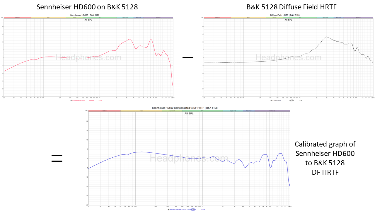 Taking the raw frequency response graph of the HD600 and subtracting the B&K 5128 DF HRTF gives us the calibrated graph. This calibrated graph is effectively the “error curve” of the HD600 where it doesn’t match the DF HRTF and thus looks flattened out compared to the original raw graphs.