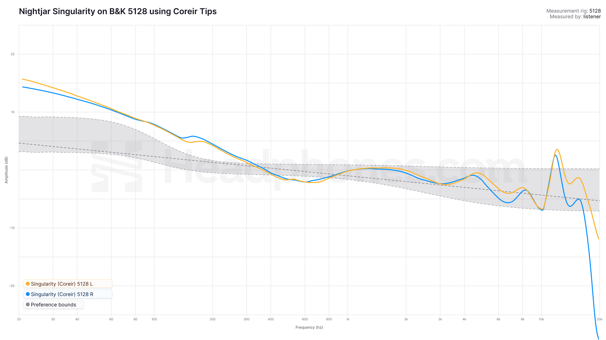 Alright, so we can see that the Sennheiser HD600 is almost dead even in the preference bounds with the exception of the subbass roll-off and some upper treble elevations that just nudges outside the bounds. There’s a reason it’s been long considered one of the best and most neutral headphones out there. Here’s a different graph - an IEM this time. It’s the Nightjar Singularity. You can read my full review of it here but TL;DR: It’s a great sounding dynamic driver IEM with a massive, massive bass boost added. Now let’s talk about how we would read its graph and think about how the frequency response translates into the listening experience.