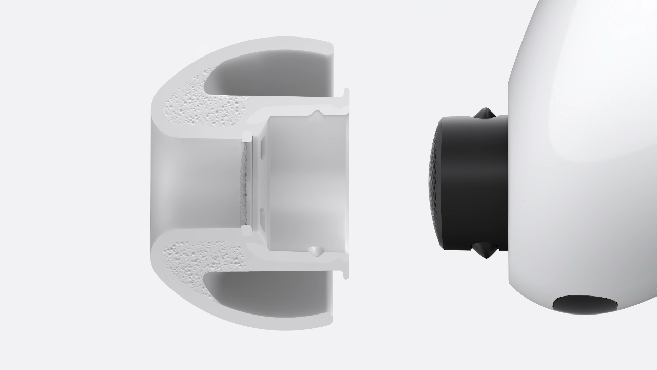 Rather, it’s those “foam-infused microspheres” that strike my interest. Based on the keynote, these are the silicone tips with a small pinch of foam around the entrance to give more structure to the tip. There will be a bit of squishiness to it, but should allow the tips to better conform to your ear. This is important because a potential improvement in seal quality could have a major impact on bass response, isolation, and comfort beyond what ANC or new acoustic ports can achieve.