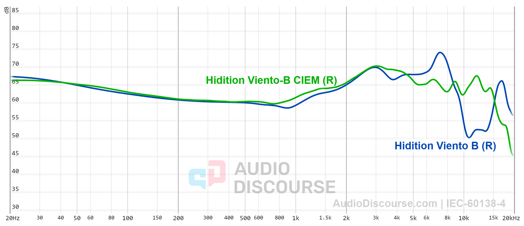 This is a graph of the Hidition Viento UIEM vs. CIEM courtesy of AudioDiscourse.com - note how the treble response of the Viento CIEM is noticeably smoother than on the UIEM.