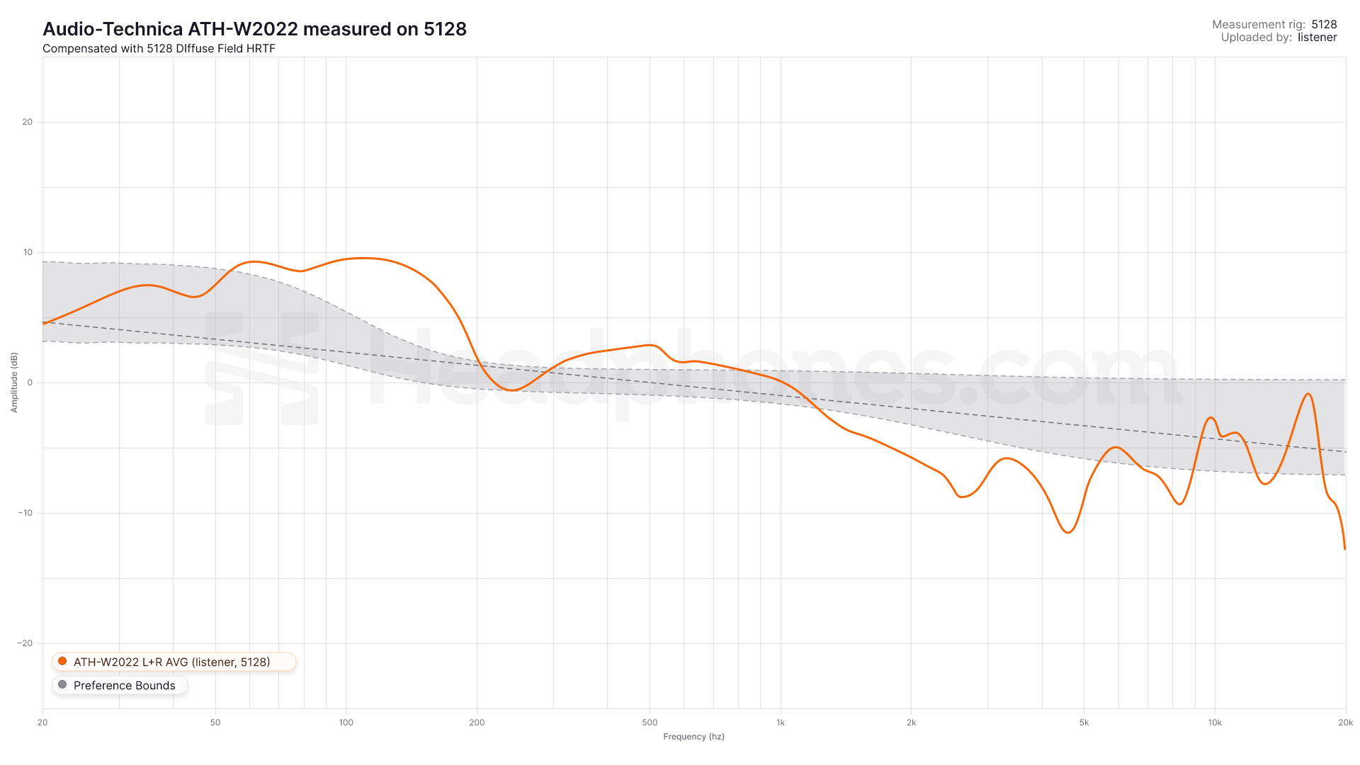 So I think I did hear a little bit more ear gain than is shown on this measurement. But it is, like, broadly as dark as it looks. Interestingly, it doesn't come across as like a like a a bass fest because it's not really like a distinct bass shelf or anything like that. It's more so just like a really, really warm headphone. It was a unique presentation that I found had a very weird sense of imaging. So I would say this is more of a headphone that I could see the good in more than something I would like, you know, choose to listen to every day. But that's my honorable mention. I think my number one pick for this sort of looks weird on a measurement, but sounds really good to me would actually be the Audio-Technica ATH-W2022. Which is their I believe nine thousand dollar close back headphone. Which yeah looks weird. It has classic closed back traits like a kind of bulbous bass shelf with a quick dip into the low mid range, a recessed ear gain, and then a kind of rocky treble response. But this is this is probably my favorite closed back headphone I've ever heard. It hits so freaking hard. It doesn't really have any problematic resonances in the treble that I typically just get with headphones in general. But also the ear gain and kind of mids presentation in general is quite unique in that because there's a low mid dip and an upper mid dip. You get this kind of like center mid-range richness that yeah has this kind of like like hardness to it that just makes again drums and guitars and really anything with any sort of percussive element to it sound really really like concrete and kind of in your face. So yeah I love that headphone. Um I wish I had the money to own one because it's also just freaking beautiful. But yeah I heard it before I squigged it, and I'm glad I did because I would have probably thought uh it it just sounds weird, but I actually really enjoy the sound.