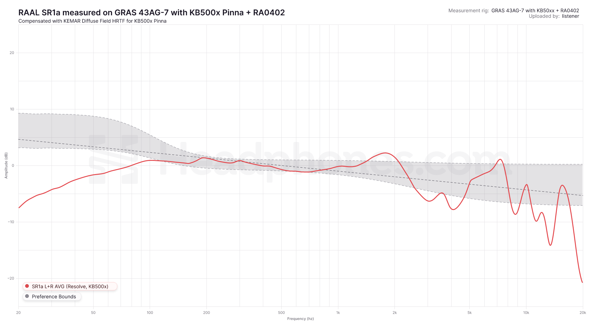 Well, continuing on Griff's note on poor ergonomics, that applies to both of my picks. The honorable mention for me has got to be the RAAL SR1A. This is a free-field, ribbon-based headphone. Well, the poor ergonomics and positional variation come in because not only can you sort of adjust the angle of the flaps itself, but also how it sits on your head is a little confusing and you can change the sound quite significantly by shifting it around a fair bit. Being free field's weird, but it doesn't measure all that bad. In fact, above about 200 Hz or so, it's actually pretty good. Uh, there's a measurement on screen now, and the general areas where it doesn't measure so well in the ear gain are more dips than they are peaks, which for me makes them a lot less objectionable. The main bit was actually where the sort of two kHz region has a lift up, rather than what you might be used to seeing with a lot of headphones, which is a dip. Interestingly though, these headphones still for me stage a huge, which is one of the reasons why I like them so much. Um, They are free-field. I don't know how much of that is effectively just expectation, because it's completely open, so you're expecting a bigger soundstage. Who knows? It's not doing any of the typical soundstage FR things, and yet it does sound big. But overall, it's tuned remarkably well. That sort of free-field nature of it just, for me, and again, I don't know how much of this is just expectation bias, but for me, I got a surprisingly excellent sense of just timbre. on it like vocals i really really like the sound of it they're more contrasty than they should be because of that sort of one to two kHz lift that does color things a bit but beyond that i just really enjoyed the sound of the headphone except for the fact that they have absolutely no bass not only do they have no bass you can't eq up the bass because they will just distort and potentially even break so actually continuing on from the ergonomics i actually ran them with a subwoofer those headphones with a subwoofer or stereo subs if you want is genuinely one of the most fun headphone experiences I've had, period. And I was pretty tempted to buy a set for myself just for that. I really, really liked them when you run them with a separate subwoofer, and I actually did a full-on digital crossover to high-pass the headphones, low-pass the subwoofers, and just integrate things as if it was a speaker setup. Stupid setup, massive giggle factor. Giggle factor is also what applies to my main pick, which is the Abyss 1266. These, in so many ways, should be terrible. They are very uncomfortable. They are very heavy. The positional variation isn't so much the issue as the fit itself, because you can adjust and change not only how they sit on your head, but how much of a seal you get. And so you can tune the bass quite a bit, and you're sort of supposed to leave a bit of an air gap, which then means you lose all of your sub-bass, below 40Hz or so, and you get a massive mid-bass peak, which directly contrasts with what I was saying earlier about not liking mid-bass focused headphones. The difference here is that it's a really narrow and sharp peak, sitting right at the fundamental of where a lot of drums and stuff are, and when you're listening to these with electronic music specifically, where you don't really need to worry about the accuracy of synths and whatever else is going on at higher frequencies, these are just stupid good fun. These make your ears kind of shake in a way that no other headphone really does, and they just I can't not smile when I'm listening to the right kind of music on these. Anything with vocals, anything with real instruments, I do not like on these headphones at all. But I do like listening to electronic music quite a bit. And for those genres specifically, these just give you a sort of ridiculous, over-the-top, massively contrasty energy that is in every way measurable and that could be defined dumb, stupid, silly, but just has that massive giggle factor. And I really like them for that reason.