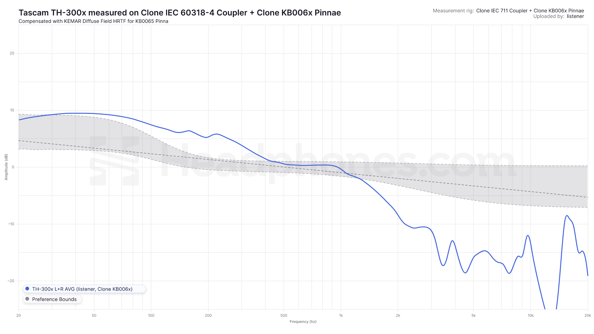 so both of my picks are closed back headphones and obviously that is where i think we start to see a little bit more weirdness pop up in a lot of headphones, especially at like the super cheap and the super expensive range, which is where both my picks end up. So my honorable mention is going to be the Tascam TH300X, which I'm sure nobody in this hobby has really heard of. I only know about it because I was working at Guitar Center when I first got my measurement rig and I measured everything we sold and I measured that headphone. Throw the measurement up on the screen here, and this is absurd. It is, indeed, as dark as it measures.