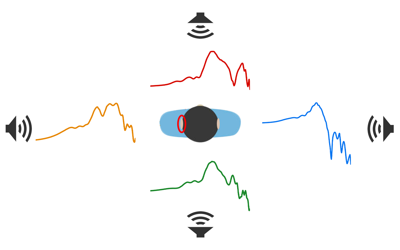 These frequency response transformations—called Head-Related Transfer Functions (HRTFs)—exist for every angle and elevation around you, and these transformations are always affecting incoming sounds for both of your ears in the real world. We’ve been listening to sounds filtered through our HRTF for our whole lives, so we’ve grown accustomed to these effects and do not actively hear them.