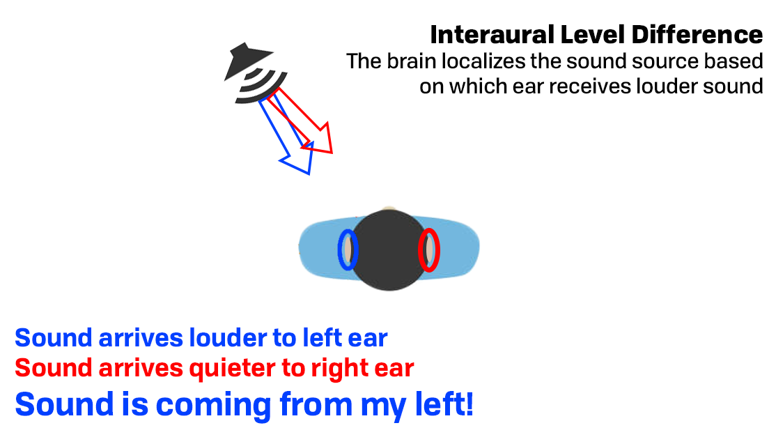 Interaural Level Difference (ILD) is even simpler: The ear closest to the sound source will receive a louder sound than the ear that is farthest from the sound source.