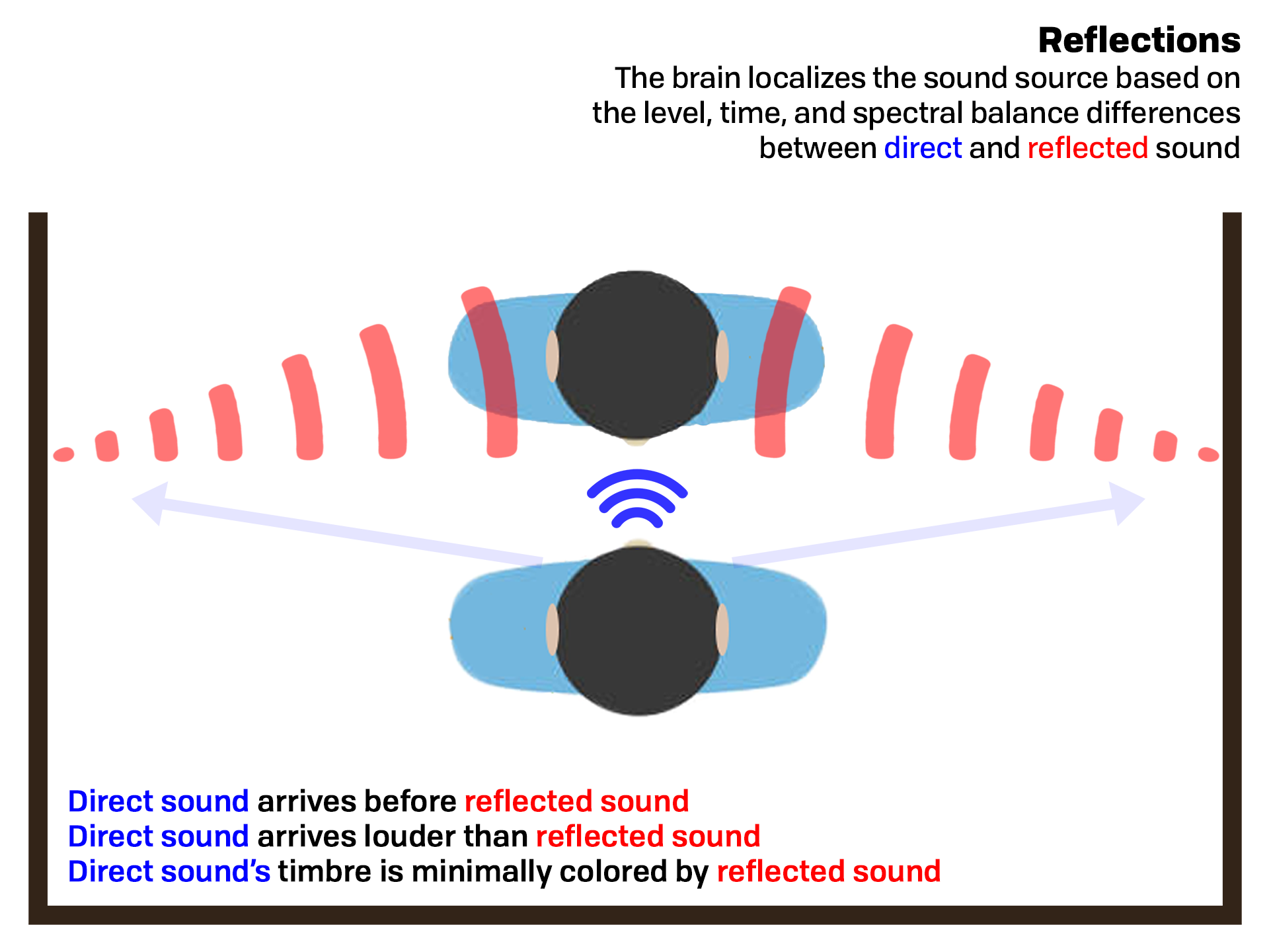 Reflections are a bit different than the other things I’ve mentioned, because we actually can consciously hear and separate indirect and direct sound rather well, unlike the ITD, ILD, and HRTF stuff. However, it’s still important to note how these reflections ultimately impact our sense of perceived distance, and thus have a part to play in how we localize sound sources in real life.