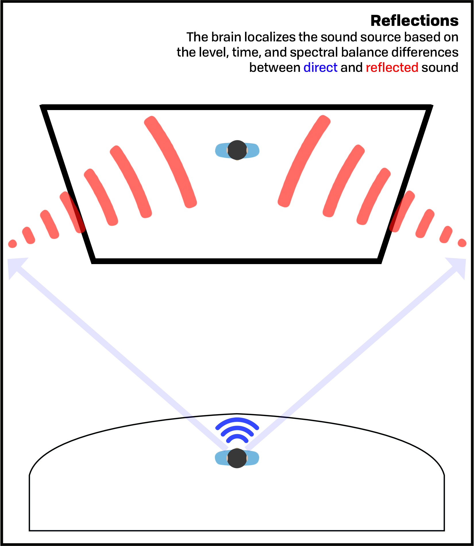 The arrival of sound at our eardrums is almost never just the sound directly emanated from a sound source. What we usually end up receiving at our ears is a combination of the “direct” sound from the sound source, as well as reflections—or “indirect” sound. Indirect sound arises from the direct sound bouncing off of surfaces like walls, floors, & ceilings, and then arriving at our ears.