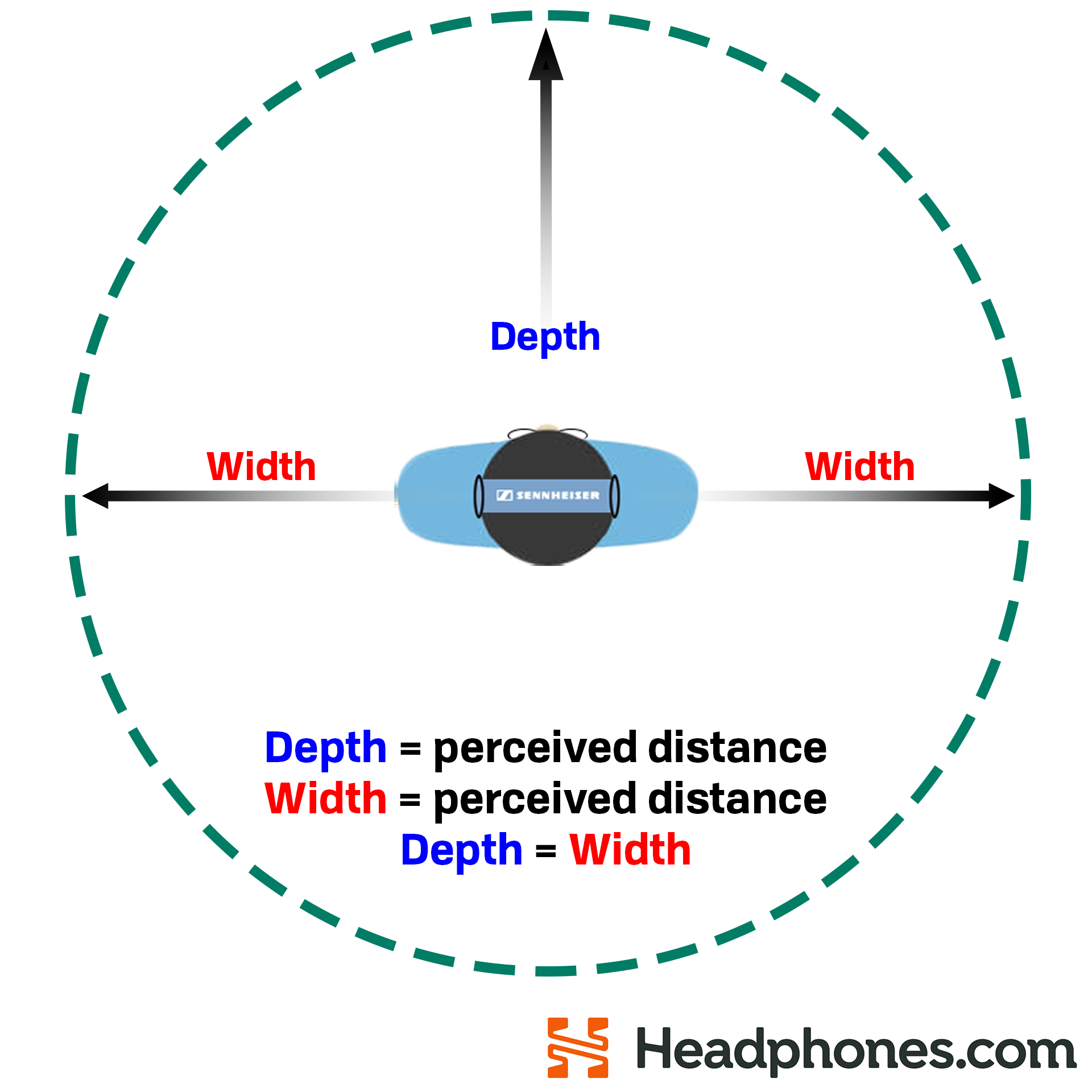 In headphones, distance and “width” as audiophiles tend to refer to it actually exist on the same axis—radial distance from the centrepoint (the listener). The only difference is that “distance” is usually thought of regarding elements panned towards the front, whereas “width” is the distance of elements panned to the sides.