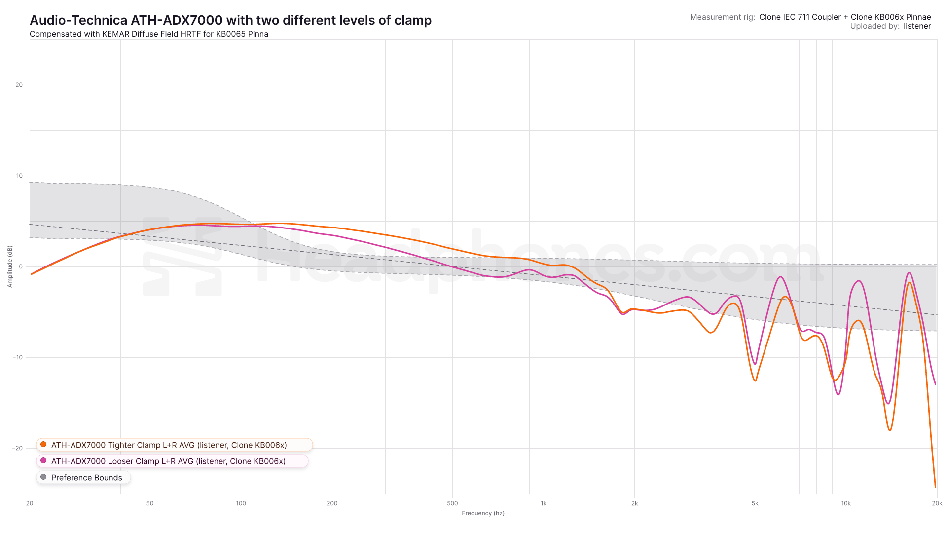 Early in my testing with this headphone I found it to be a bit brighter than I initially expected given others’ impressions. I quickly learned that this was due to the person who heard this unit before me having a significantly larger/wider head than I do. For that reason, I revisited my initial measurements, this time adding clamp by bending the headband, and got a significantly warmer/darker result than my initial measurements.