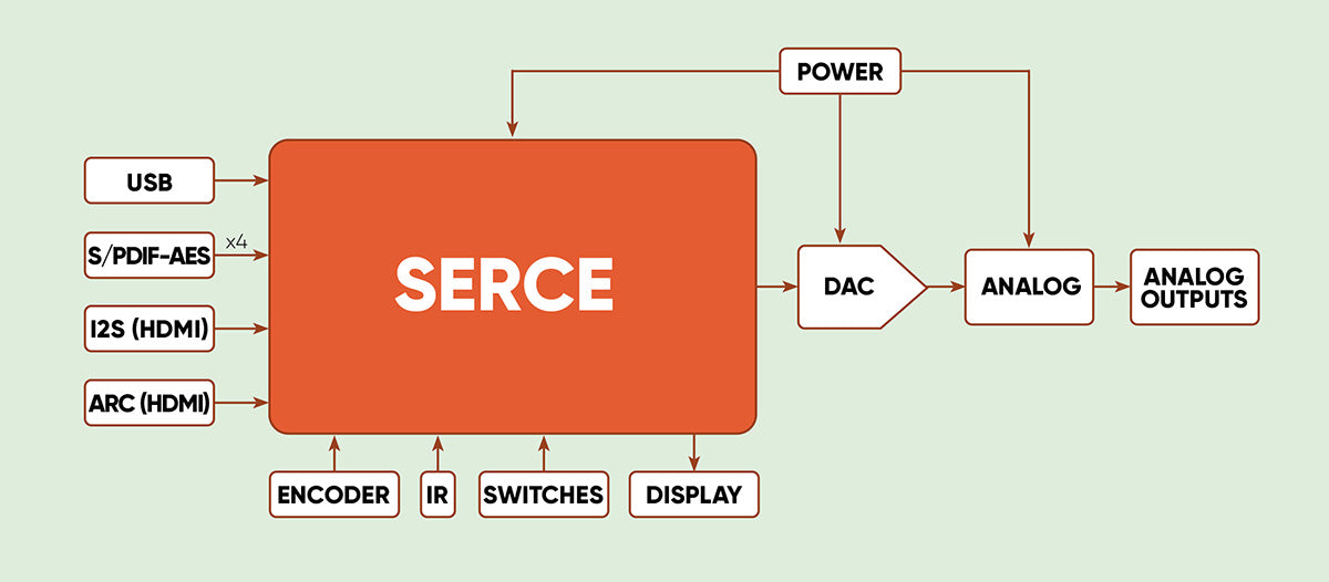 The user has the choice of selecting digital volume control, in which case all attenuation is done in the digital domain by the SERCE processor, or in the analog domain, where the DAC converts the digital signal at full level, and then attenuation is done by the resistor ladder ICs.