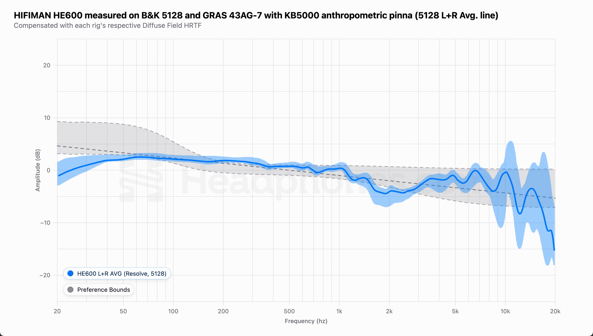 The ear-gain region (2-4 kHz) is spot-on, giving vocals and instruments a crisp sense of presence without sounding shouty. Any more energy in specifically the 3-5 kHz band here would be too much, so its good that the HE600 exhibits restraint in this one band.