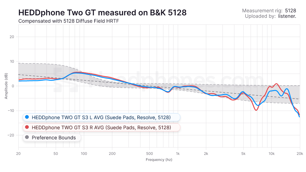 For starters, the HEDDphone Two GT’s low-treble has a mild 5 kHz peak which seems to change its gain slightly based on earpad choice as well as clamp force. Personally I don’t notice the elevation shown on our measurements at all, but some listeners may. If anything it’s a bit relaxed in the 5-8 kHz band overall for me, but I can typically handle a dark presentation.