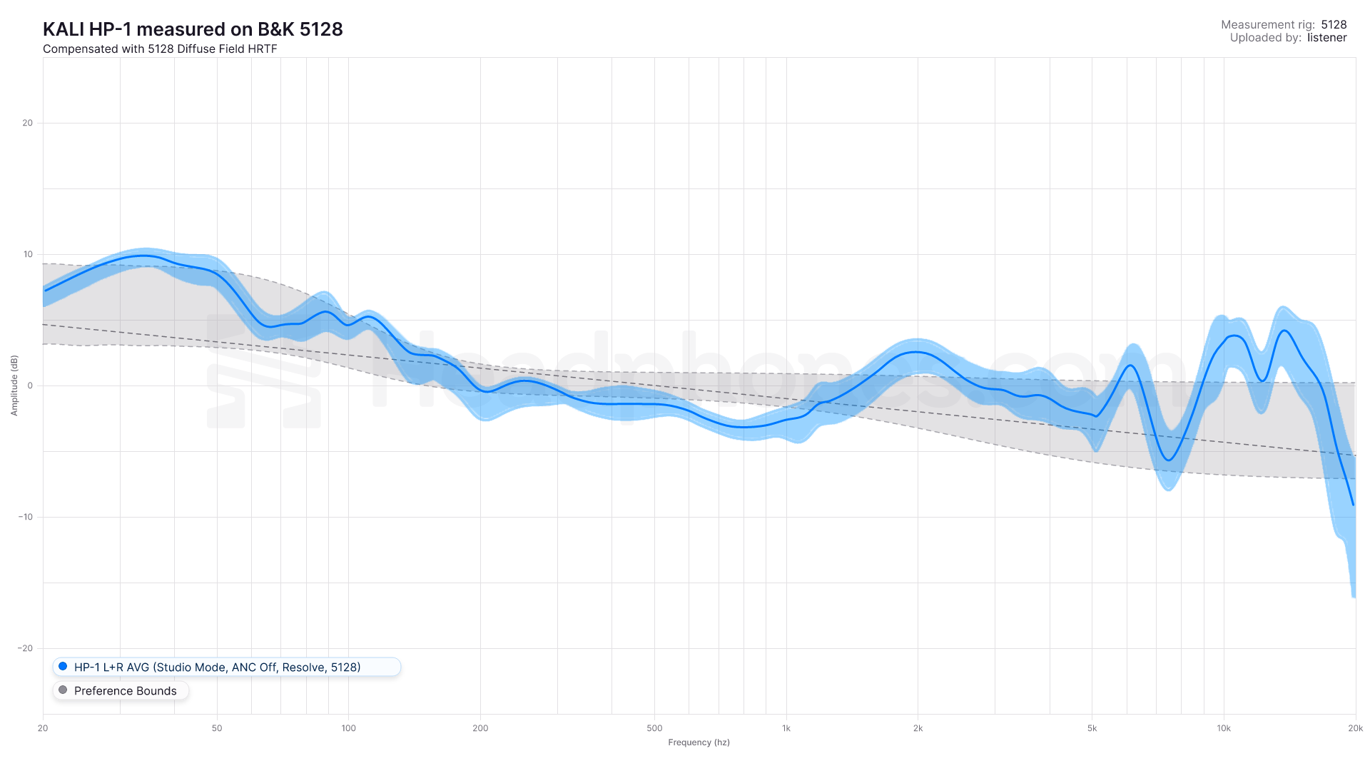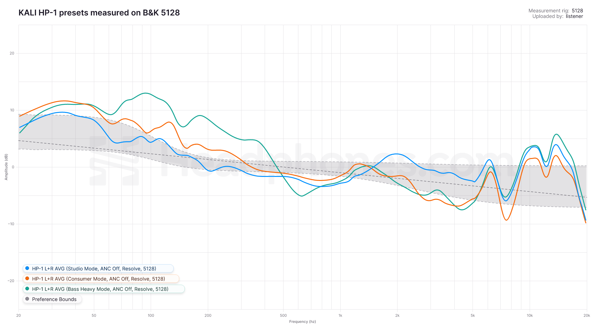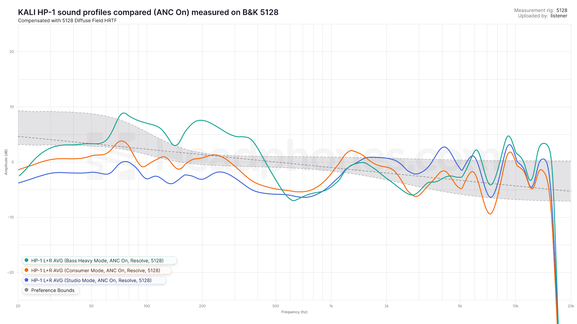 So the KALI HP-1, it has ANC in it, but you really shouldn't think of this as an ANC headphone. This should be thought of strictly as a studio reference headphone, a wireless studio reference headphone. With several different things to be used as the reference, right? So when we think about we talk about reference, a lot of people think that it's a reference because that's what things are supposed to sound like. But that's not what's going on here— it's more reference to very specific things. And that's probably a better way to think about, you know, the concept of reference generally. One of those things is the Harman target. So in their default ANC off the studio mode, it's meant to be a Harman-like kind of sound signature. And then you have two other different profiles. One is called consumer, and the other one is called bass.