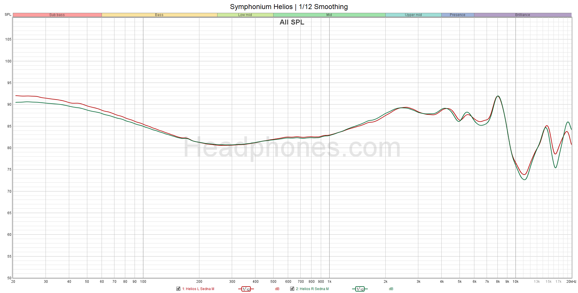 Frequency response of the Symphonium Helios. Measurement taken with an IEC-711 clone microphone. Comparisons can only be made relative to other measurements taken by this specific microphone. A peak at about 8 – 10 kHz is likely an artifact of the measurement rig and may not exist as depicted here. Measurements above 8 kHz are not accurate.