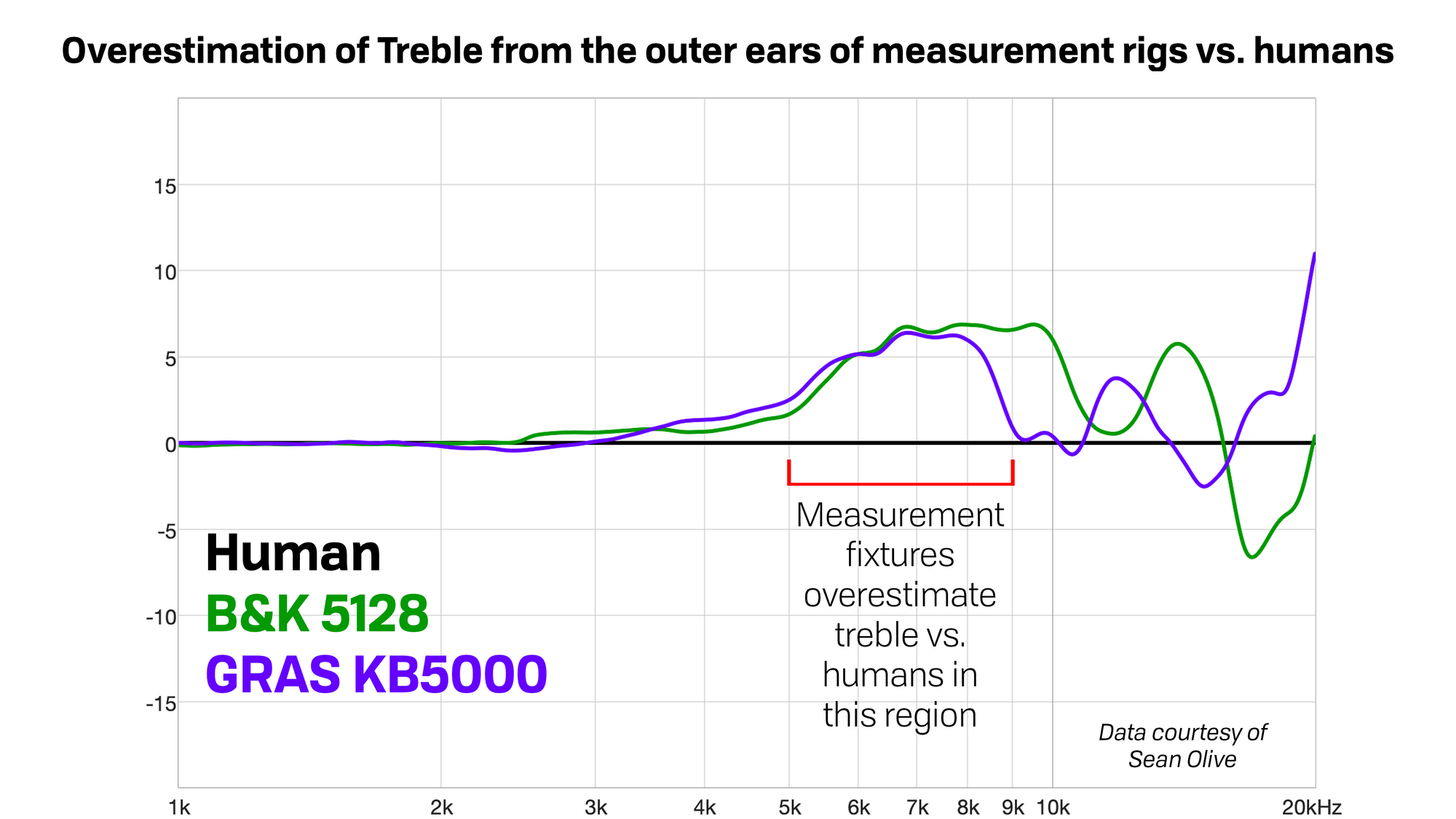 There’s solid evidence from researchers like Sean Olive and Fabian Brinkmann that headphone measurement rigs tend to overestimate energy in exactly this region. Human ear responses often dip in the 6–9 kHz band, while test fixtures don’t. On my head, I hear maybe a narrow emphasis around 6 kHz, but I don’t hear the broad 7–9 kHz elevation at all.