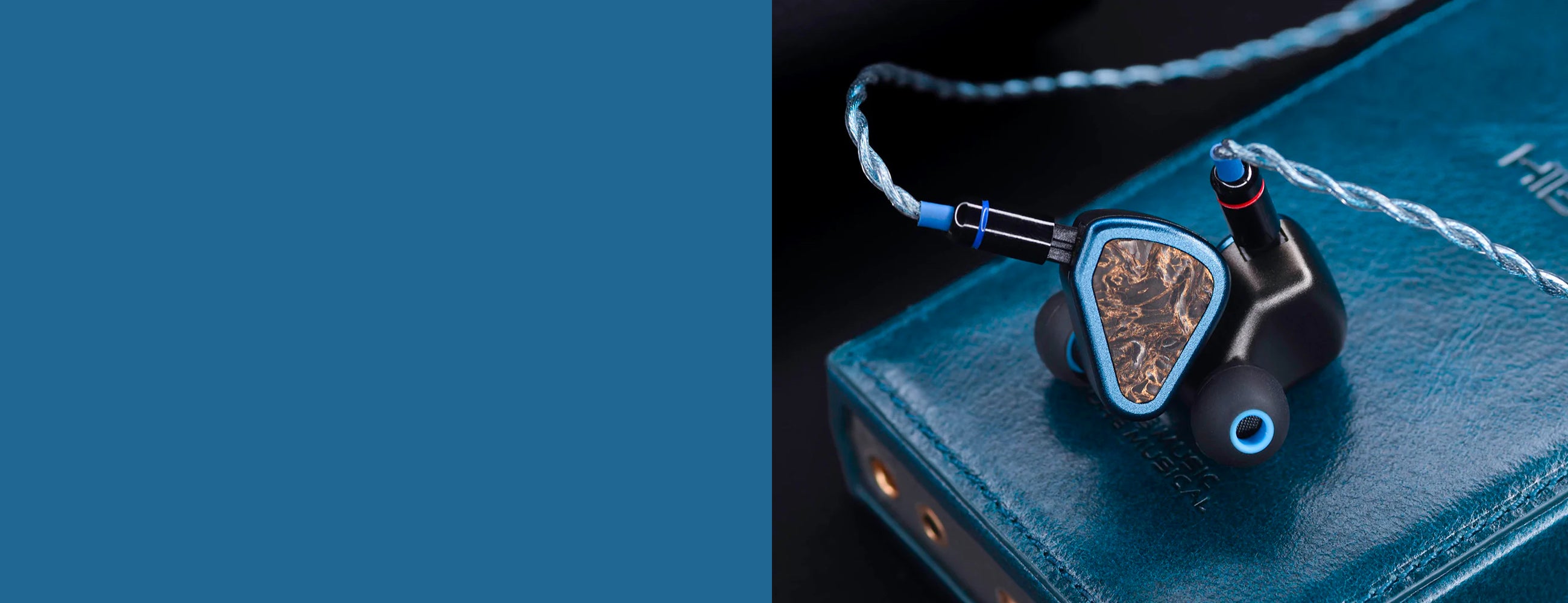 The Titan's design is inspired by the stunning Lapis Lazuli, featuring an anodized blue color complemented by a premium forged carbon faceplate adorned with yellow gold accents. Each faceplate is unique due to the nature of the carbon composite, ensuring that no two sets are the same and adding a touch of luxury to your listening experience.